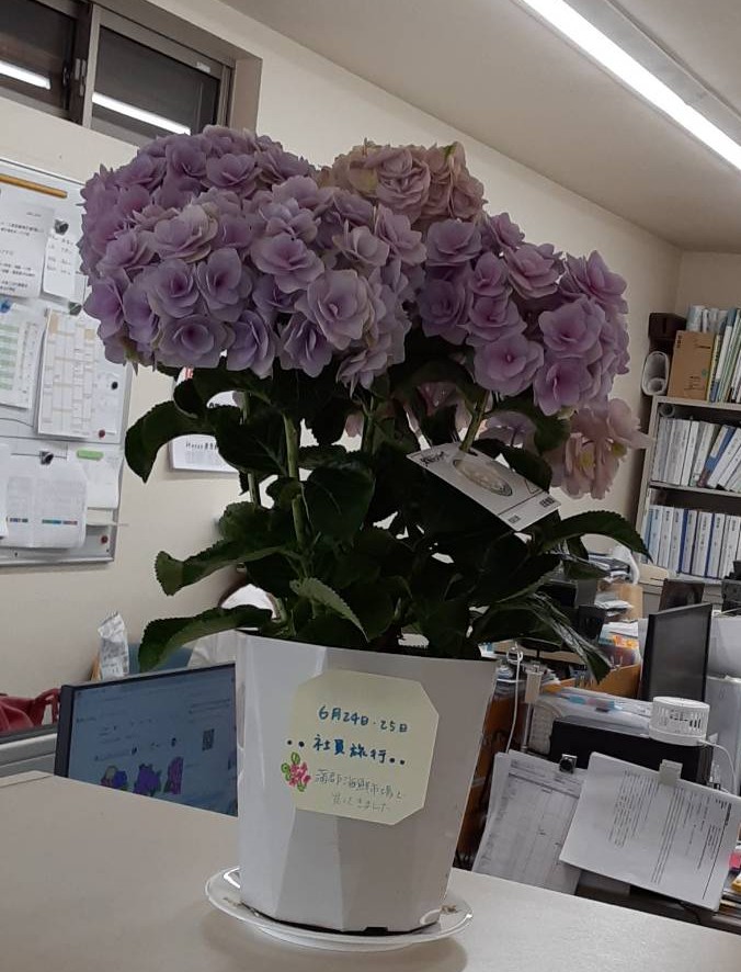 | 2025/07/01 | あじさい 一昨年、社員旅行先でピンクのあじさいを買い、事務所でふた冬越しました。今年は、ちいさなむらさきのあじさいがひとつ咲きました。 |